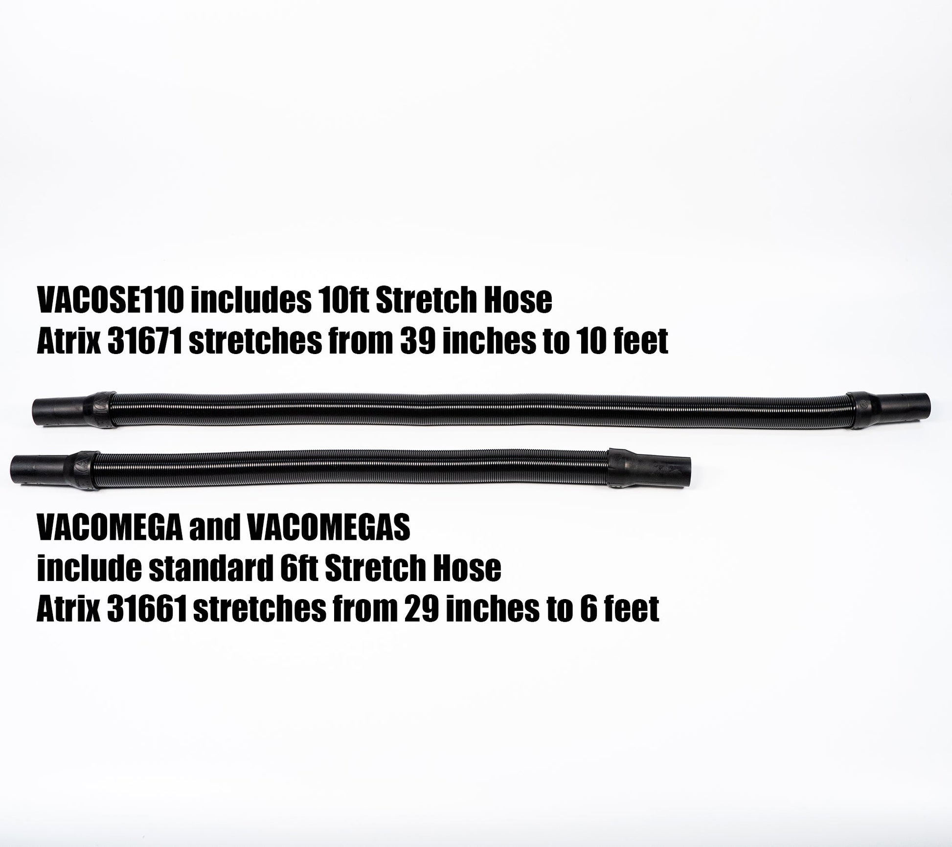Le VACOSE110 est fourni avec un tuyau extensible de 3 m (Atrix 31671) d'une longueur de 99 cm à 3 m. Les VACOMEGA et VACOMEGAS sont fournis avec un tuyau extensible standard de 1,8 m (Atrix 31661) d'une longueur de 74 cm à 1,8 m.