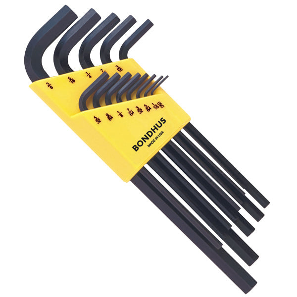 Le jeu de clés hexagonales Bondhus 12132 pouces comprend les tailles suivantes : 0,050 pouce, 1/16 pouce, 5/64 pouce, 3/32 pouce, 7/64 pouce, 1/8 pouce, 9/64 pouce, 5/32 pouce, 3/16 pouce, 7/32 pouce, 1/4 pouce, 5/16 pouce et 3/8 pouce.