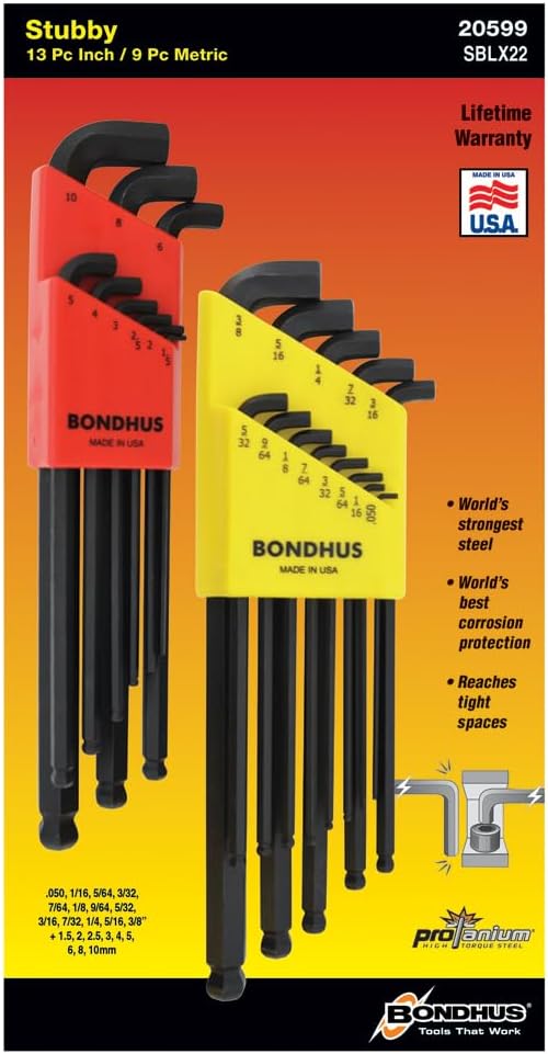 Jeu de clés Allen courtes à embout sphérique Bondhus 20599, SBLX22 pouces 16537 + métrique 16599