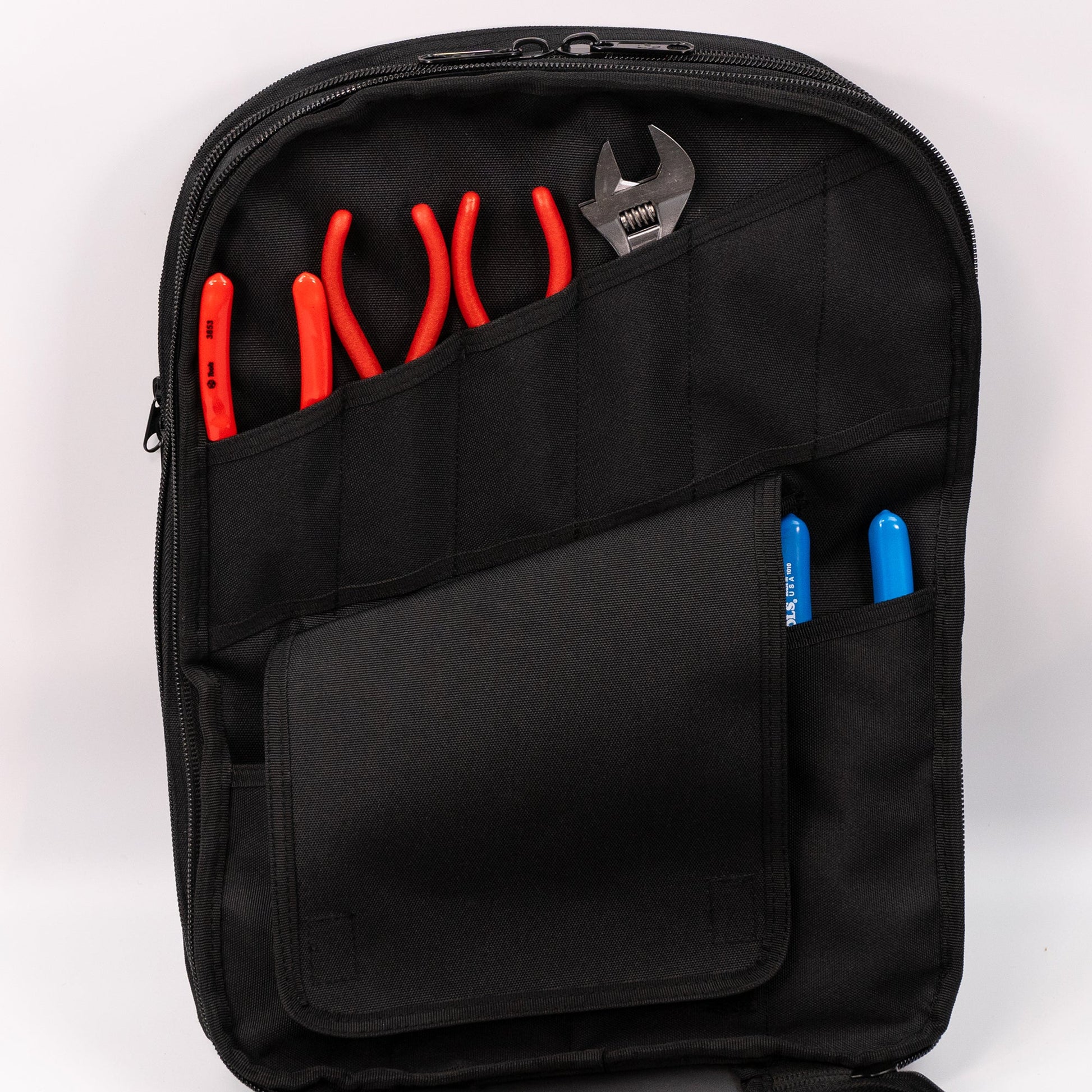 Le modèle 63-BP4 comprend la trousse à outils ToolPak™ n° 03100, un sac à dos à quatre panneaux mesurant 48 cm x 36 cm x 13 cm, doté de 60 compartiments pour outils. Cette trousse à outils de haute qualité, avec fermeture éclair, est fabriquée en nylon polyester 1200 deniers imperméable, présente une conception ergonomique, une poignée gainée de cuir et des fermetures éclair robustes.