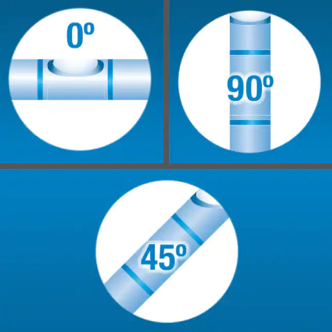 Les fioles en acrylique durable permettent de lire l'aplomb, le niveau et un angle de 45 degrés.